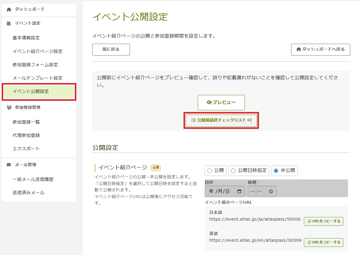 [イベント公開設定]メニューをクリックし、[プレビュー]ボタンをクリックします。プレビュー画面で誤りや記載漏れがないことを確認します。