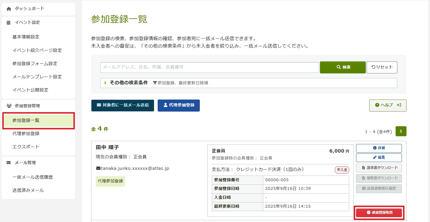 確認後、利用料の対象とならないように、[参加登録一覧]メニューでテスト登録を検索し、[参加登録取消]ボタンをクリックして参加登録を取り消します。